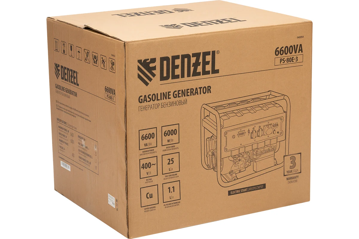 Генератор бензиновый PS-80E-3, 6,6 кВт, 400В, 25 л, электростартер// Denzel