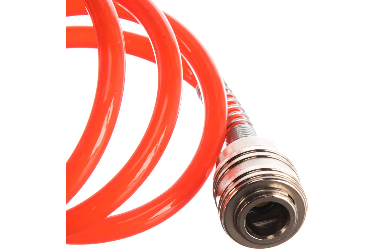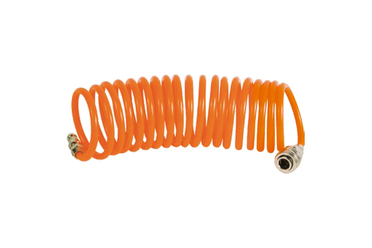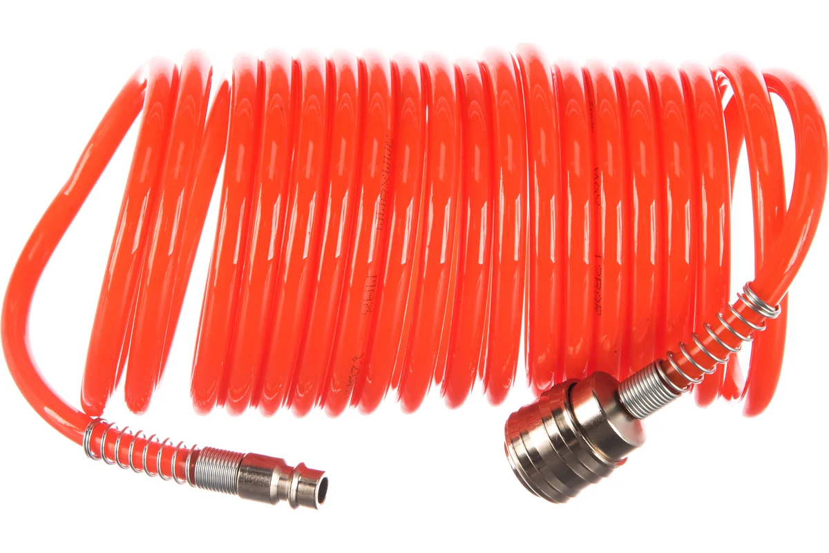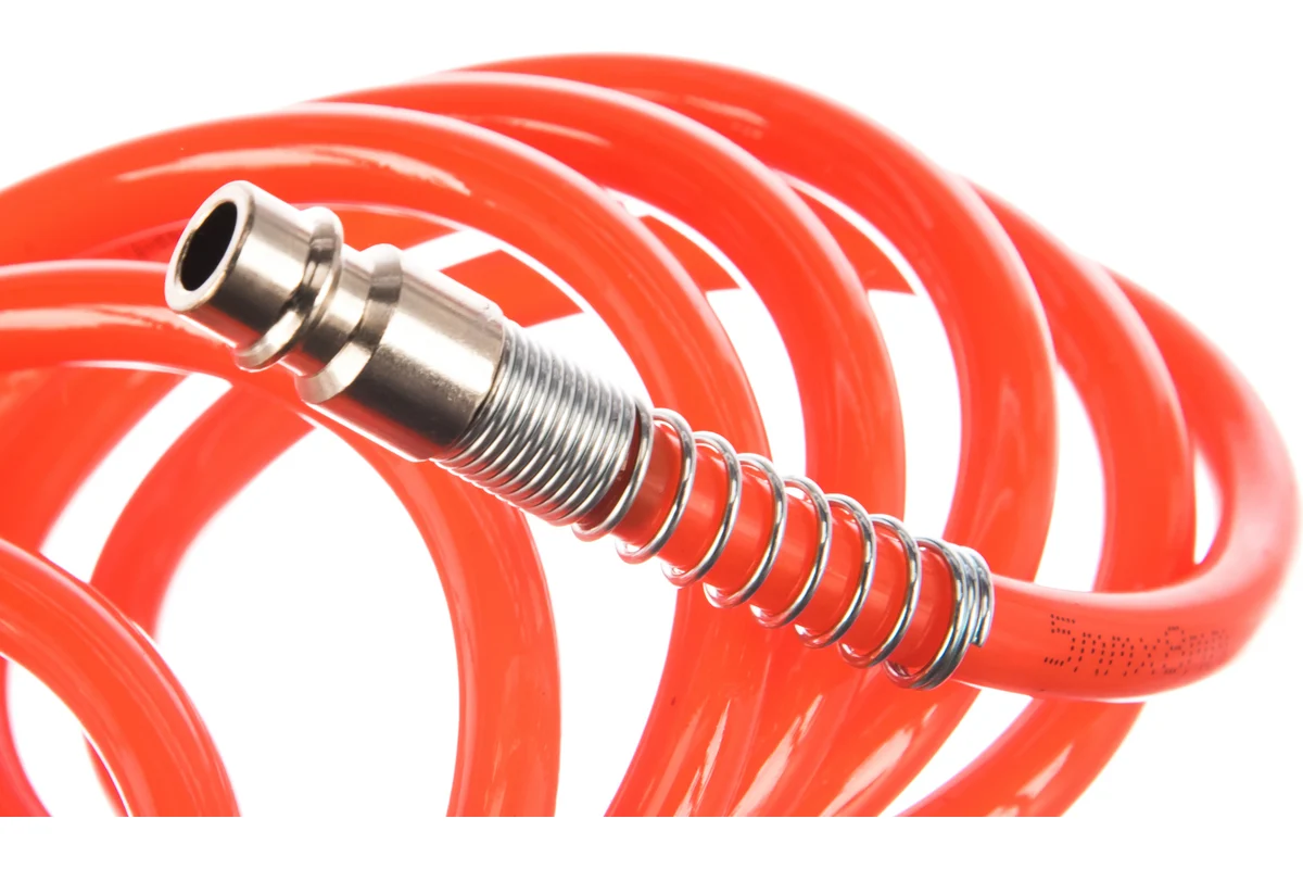 Шланг спиральный служит удлинителем между компрессором и рабочим инструментом. Изготовлен из полиуретана. Достаточная длина оснастки позволяет осуществлять работы на нужном расстоянии от компрессора. Шланг оснащен фитингами рапид.
