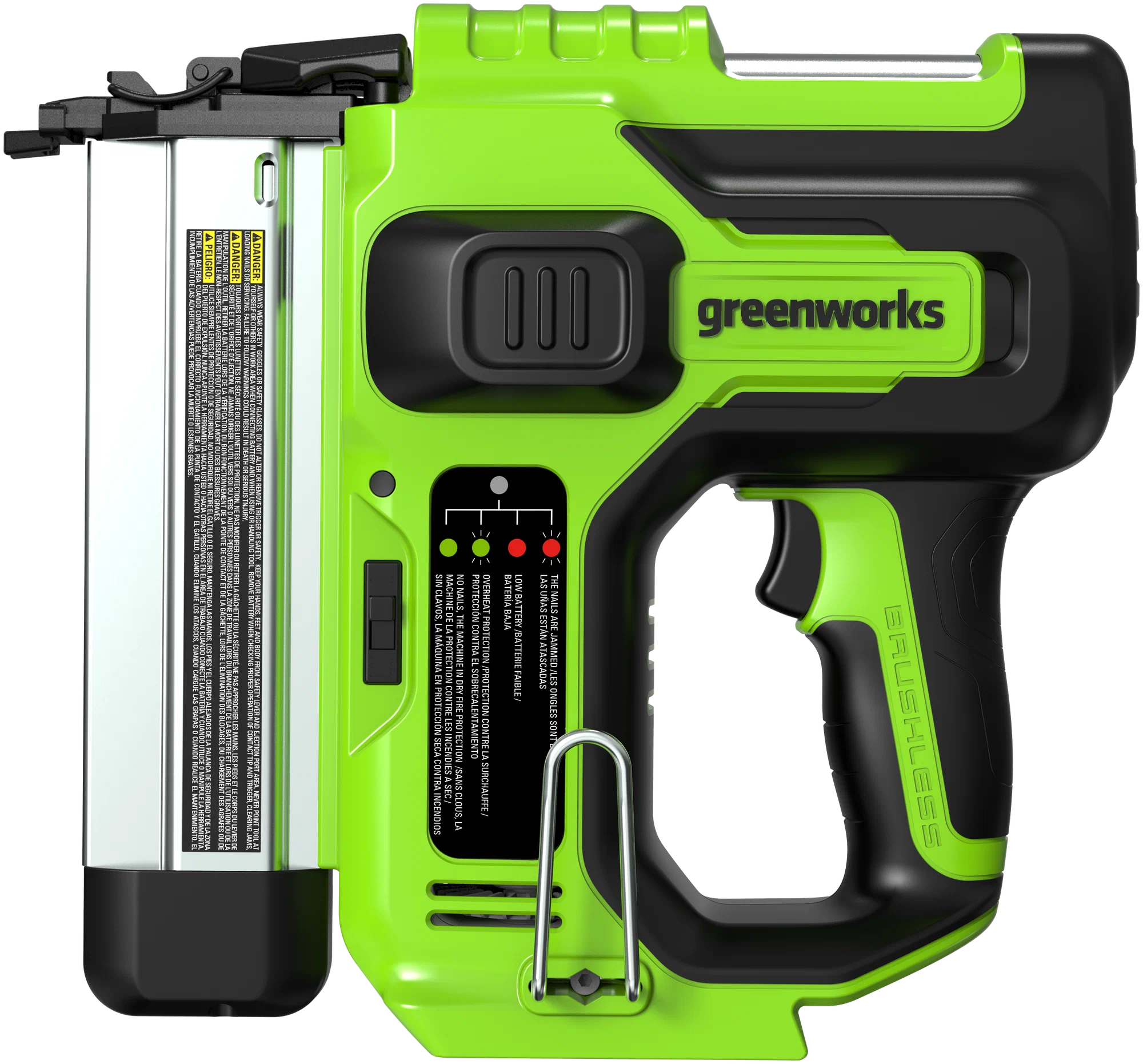 Нейлер аккумуляторный предназначен для декоративных и отделочных работ. В качестве оснастки подходят гвозди длиной от 19 до 50,8 мм. Инструмент работает в двух режимах: единичный удар для точной забивки или скоростной удар для максимальной производительности. Бесключевая регулировка глубины забивания позволяет предохранить поверхность материала от повреждения. Благодаря двум светодиодам подсветки можно работать в слабоосвещенных местах. Для надежного удержания инструмента рукоятка и часть корпуса прорезинены.