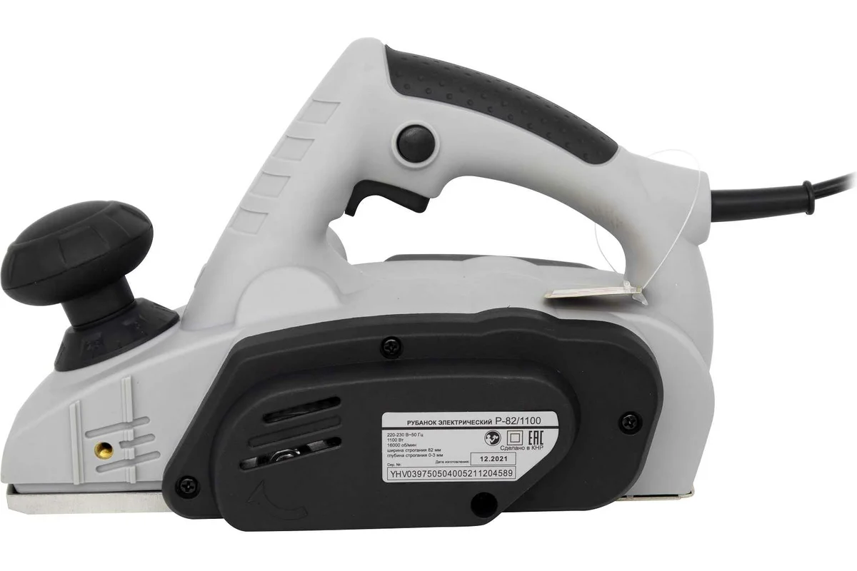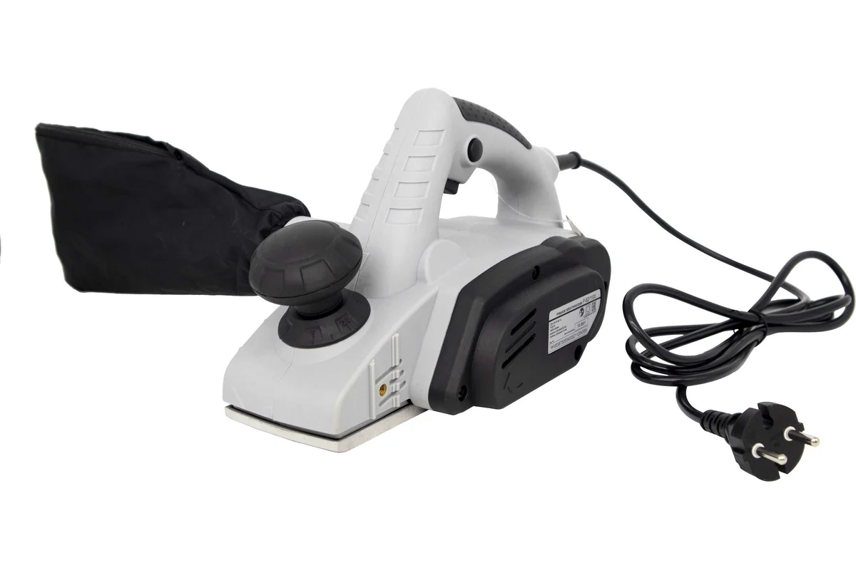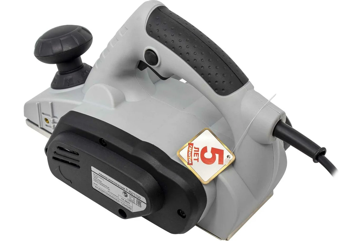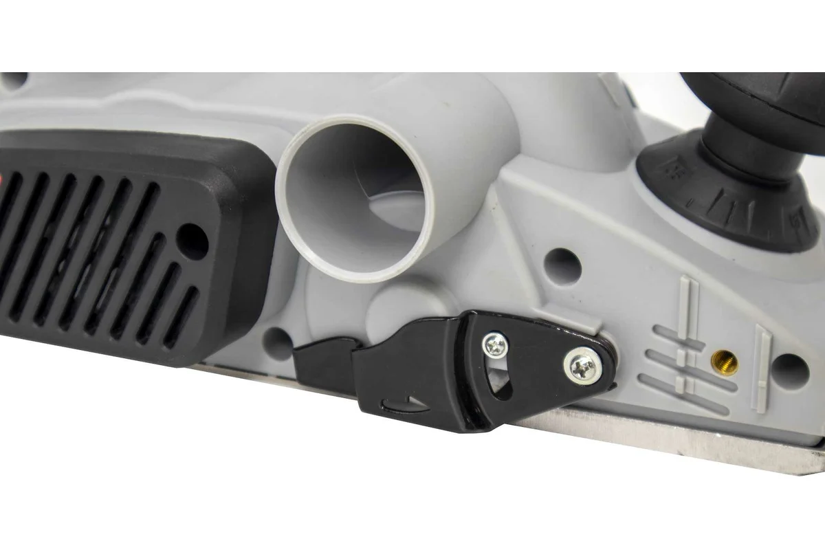 Инструмент работает от сети, оснащен надежным электродвигателем мощностью 1100 Вт и числом оборотов 16000 в мин. Для обеспечения воздушного охлаждения мотора в корпусе предусмотрено наличие специальных вентиляционных отверстий. Электрорубанок легко справляется с любыми породами дерева и разными видами пиломатериала. Ширина строгания – 82 мм. В зависимости от стоящих задач глубину строгания можно менять в диапазоне от 0 до 3 мм. Для ее изменения достаточно повернуть шарообразную рукоятку, расположенную в передней части корпуса. Вокруг ручки имеется круговая шкала, которая позволяет точно выставить нужный параметр. Электрический рубанок имеет удобную эргономичную форму с широкой рукояткой и дополнительной ручкой. Кнопка включения расположена в удобном для нажатия месте. Устройство имеет блокировку на случай непреднамеренного запуска, а также фиксацию выключателя для удобства длительной работы с инструментом. Во время строгания стружка отводится в сторону, что обеспечивает чистоту и аккуратность выполнения работ. Ножи с двусторонней заточкой увеличивают длительность использования инструмента без необходимости делать перерыв на затачивание лезвий.