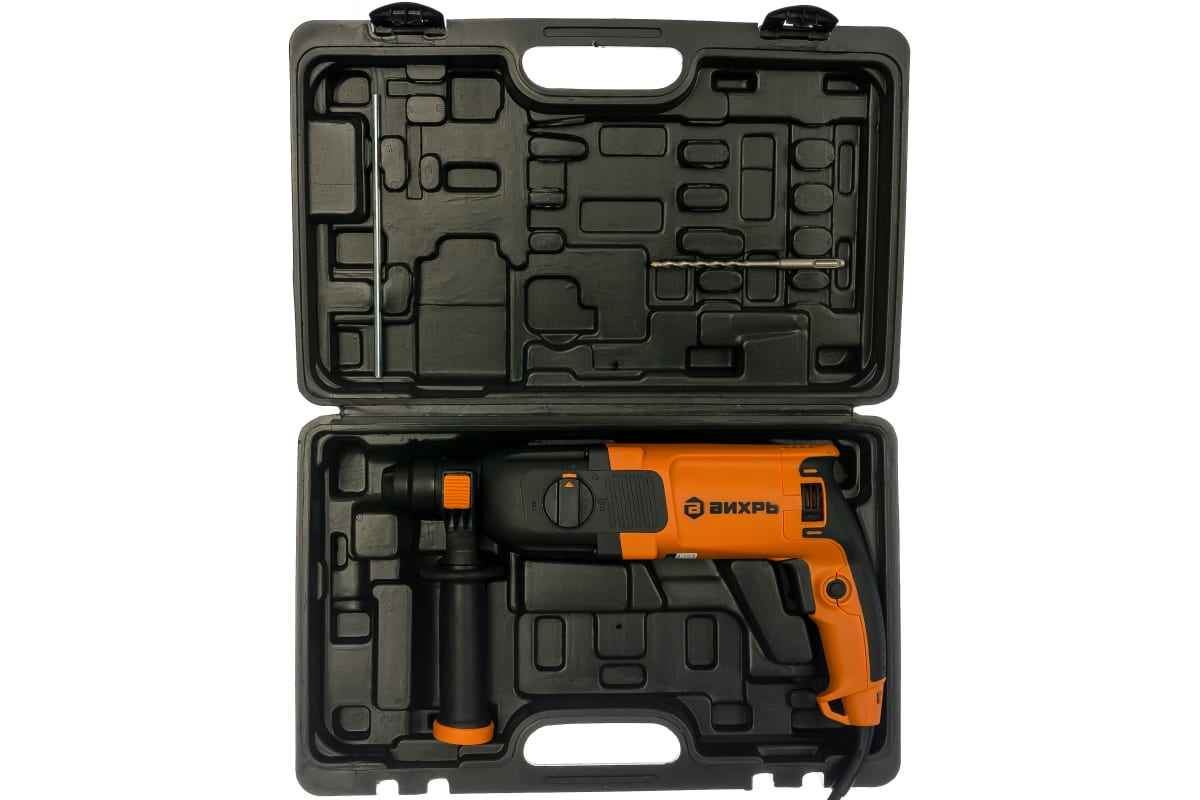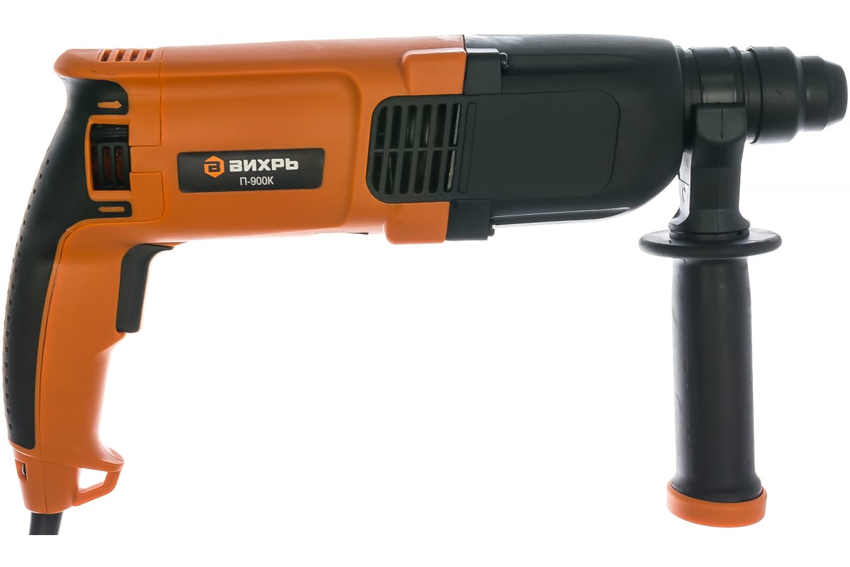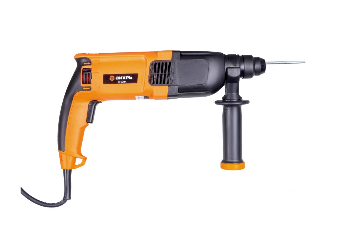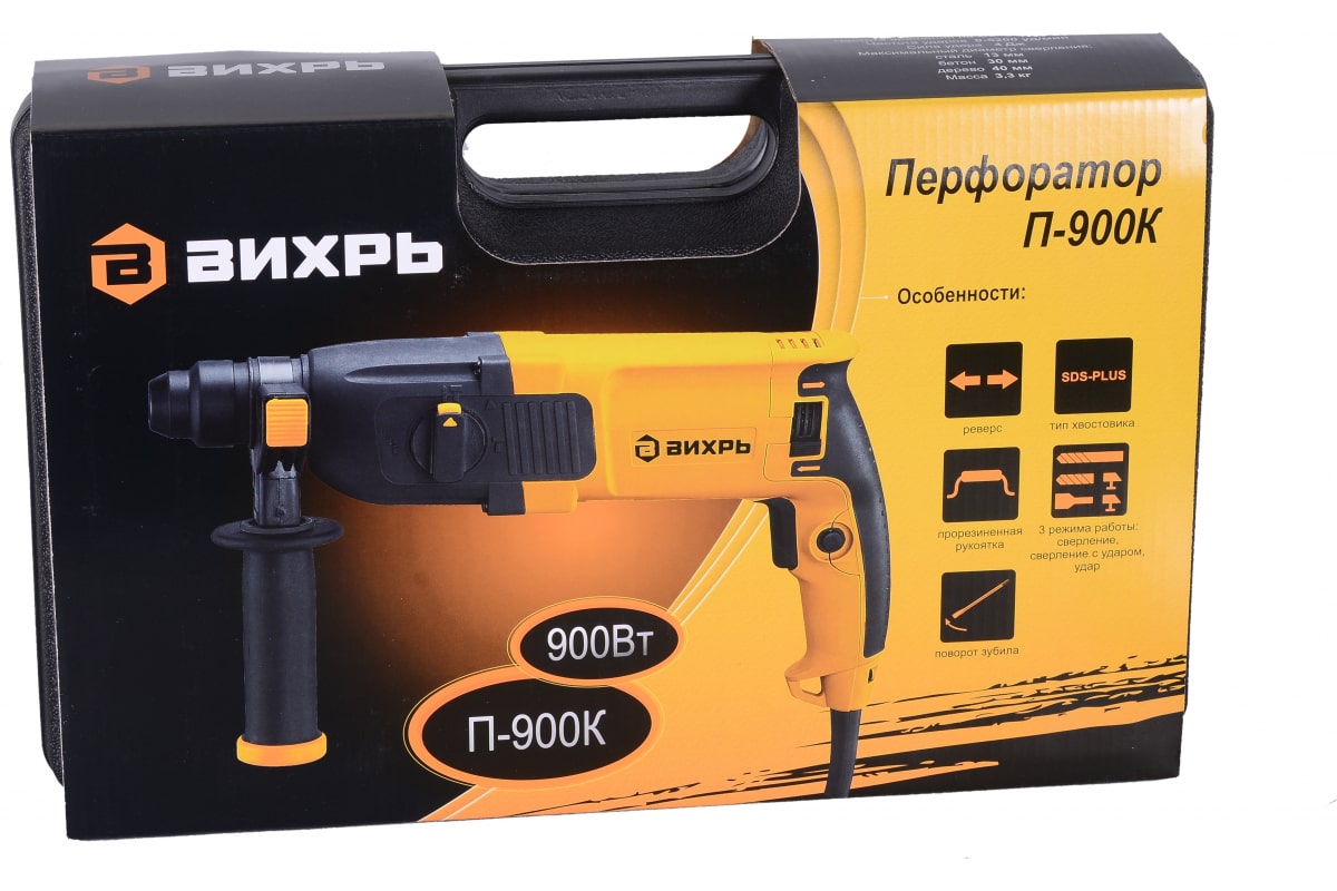 Перфоратор Вихрь П-900К обладает весом 2,7 кг. Настройка углового положения инструмента обеспечивают удобство использования в труднодоступных местах.Электроинструмент имеет функцию реверсивного хода. Применяется для извлечения застрявшего бура из материала. Блокировка случайного включения исключает возможность непреднамеренного нажатия пуска. Есть возможность блокировки кнопки во включенном состоянии в случае длительной работы. Дополнительная рукоятка позволяет эффективно распределять усилия и снижает вибрацию. В комплект входит кейс для хранения.
