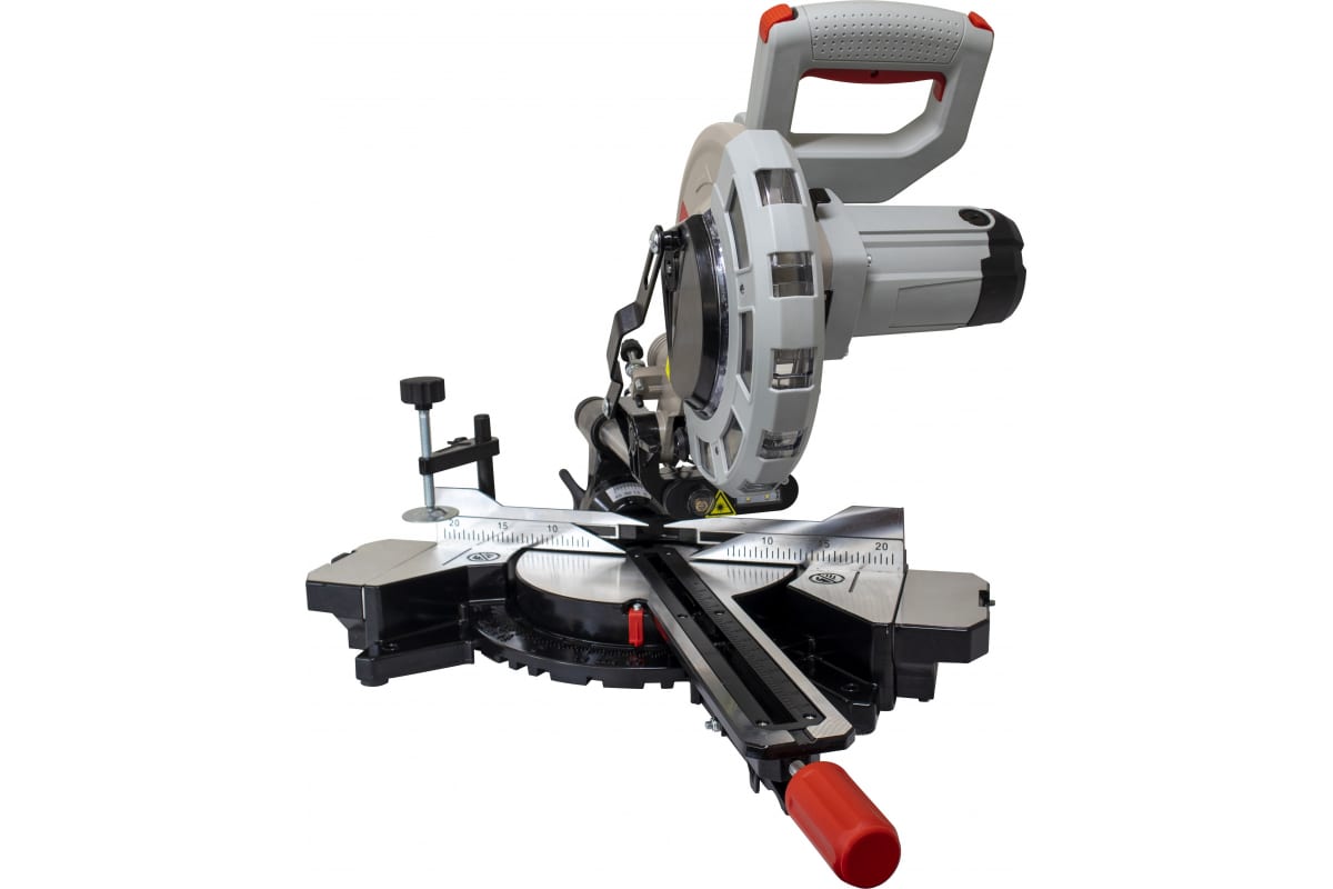 Торцовочная пила имеет прямой привод, номинальная мощность двигателя 1800 Вт. Вал редуктора защищен от случайного срабатывания, на время замены оснастки он блокируется кнопкой. Пильный диск 210 мм. Частота вращения диска в 5000 об/мин обеспечивает чистый и ровный срез. Для безопасности рабочего все подвижные режущие части закрыты защитными кожухами. Пыль отводится через патрубок в пылесборный мешок или пылесос.