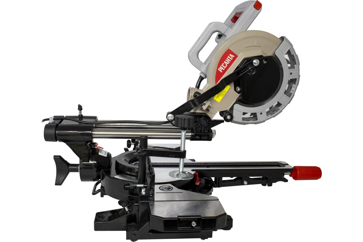 В модели Ресанта ТП-210ПЛ голова пилы подвижна, что позволяет выполнять поперечные, вертикальные угловые и комбинированные разрезы. Для заготовок большого размера есть функция пиления с протяжкой, расширители стола и надежная струбцина для фиксации. Ширина пропила доходит до 340 мм при выставленном угле 90° и не превышает 240 мм при 45°. Наибольшая глубина реза варьируется от 38 до 70 мм в зависимости от угла наклона. Для ее регулировки предусмотрены ограничители.