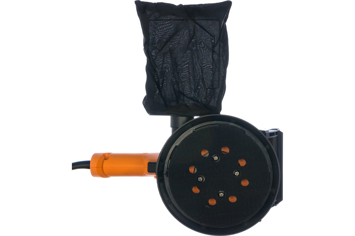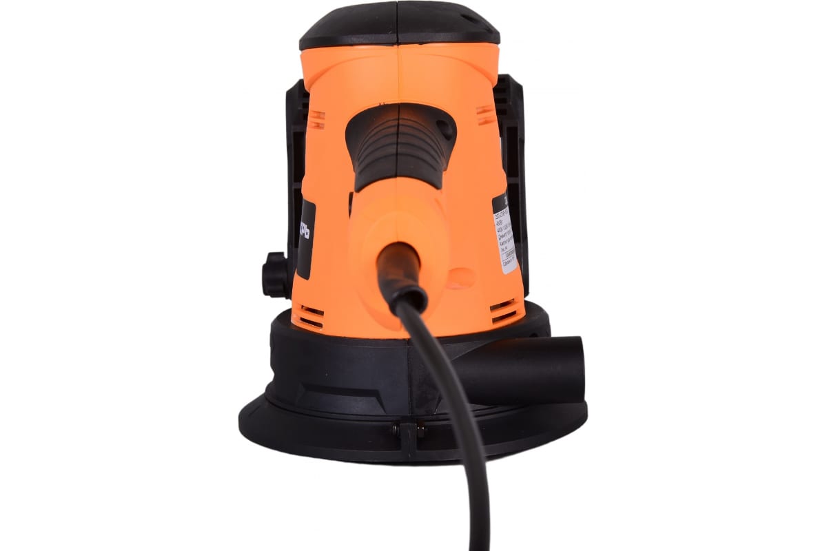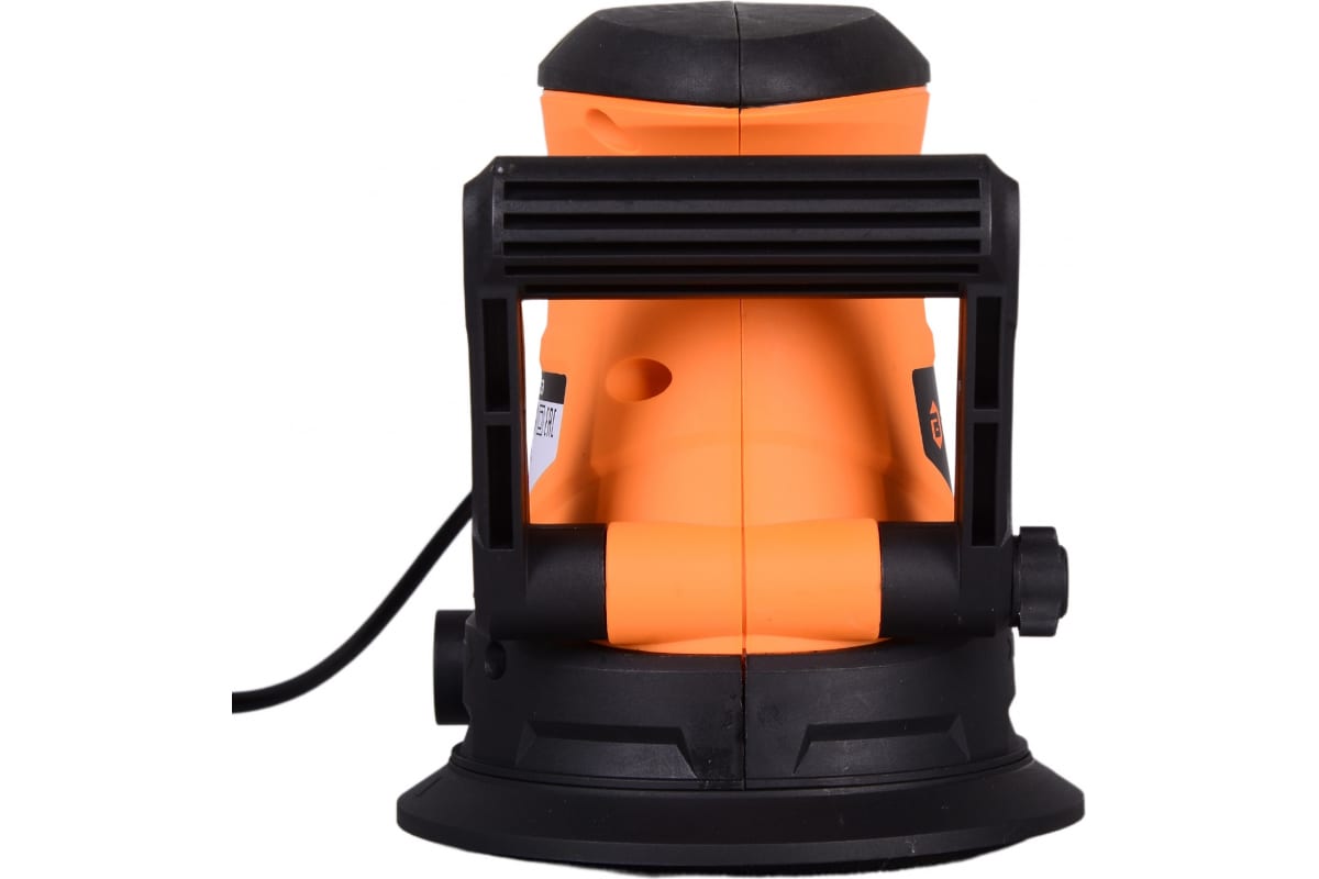 Устройство упростит обработку профильных, объемных, криволинейных поверхностей большой площади. Шлифовальная подошва диаметром 125 мм вращается по орбите и одновременно крутится вокруг своей оси. Такое комбинированное вращение позволяет добиться высокого качества шлифования практически без погрешностей. Круги разной зернистости легко фиксируются на подошве благодаря наличию липучки. Регулировка оборотов позволяет выбрать оптимальный режим (4000-13000 об/мин). Скорость вращения можно регулировать силой нажатия на клавишу выключателя, что дает возможность более тонкой настройки режима работы. Шлифмашина весит 2,1 кг. Для удобства использования корпус оснащен двумя ручками: основная расположена в непосредственной близости от выключателя, дополнительная может менять угол наклона для повышения комфортности удержания. В подошве предусмотрены технологические отверстия для вентилирования устройства, отведения пыли и опилок, пылесборник входит в базовую комплектацию.