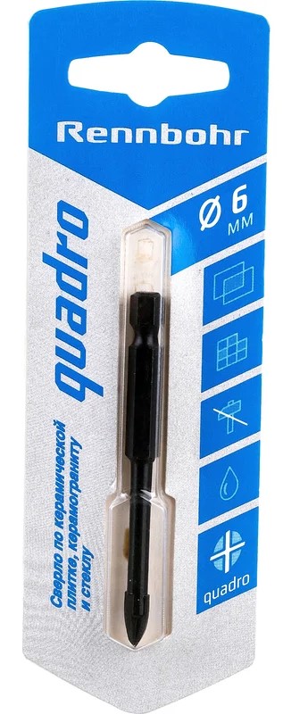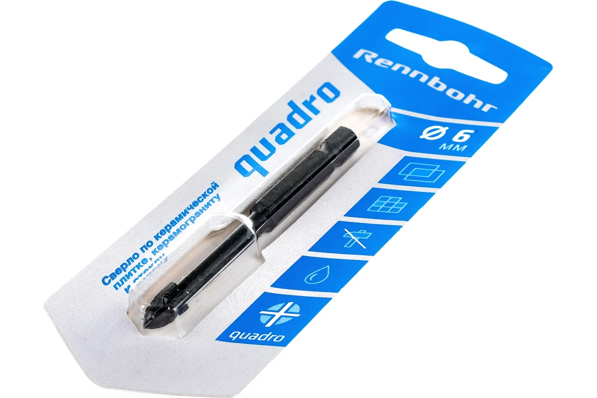 Сверло по керамике применяется для сверления отверстий в керамической плитке 1-4 класса твёрдости, керамограните, стекле. Твердосплавная напайка изготовлена из карбид-вольфрамового сплава. Сверло имеет четыре грани. Сверление следует проводить на низких скоростях с охлаждением сверла и места сверления.