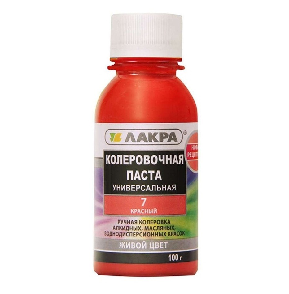 Колер Лакра №7 красный используется для колеровки водно-дисперсионных, масляных и алкидных красок, а так же для тонирования штукатурки и шпаклевки.