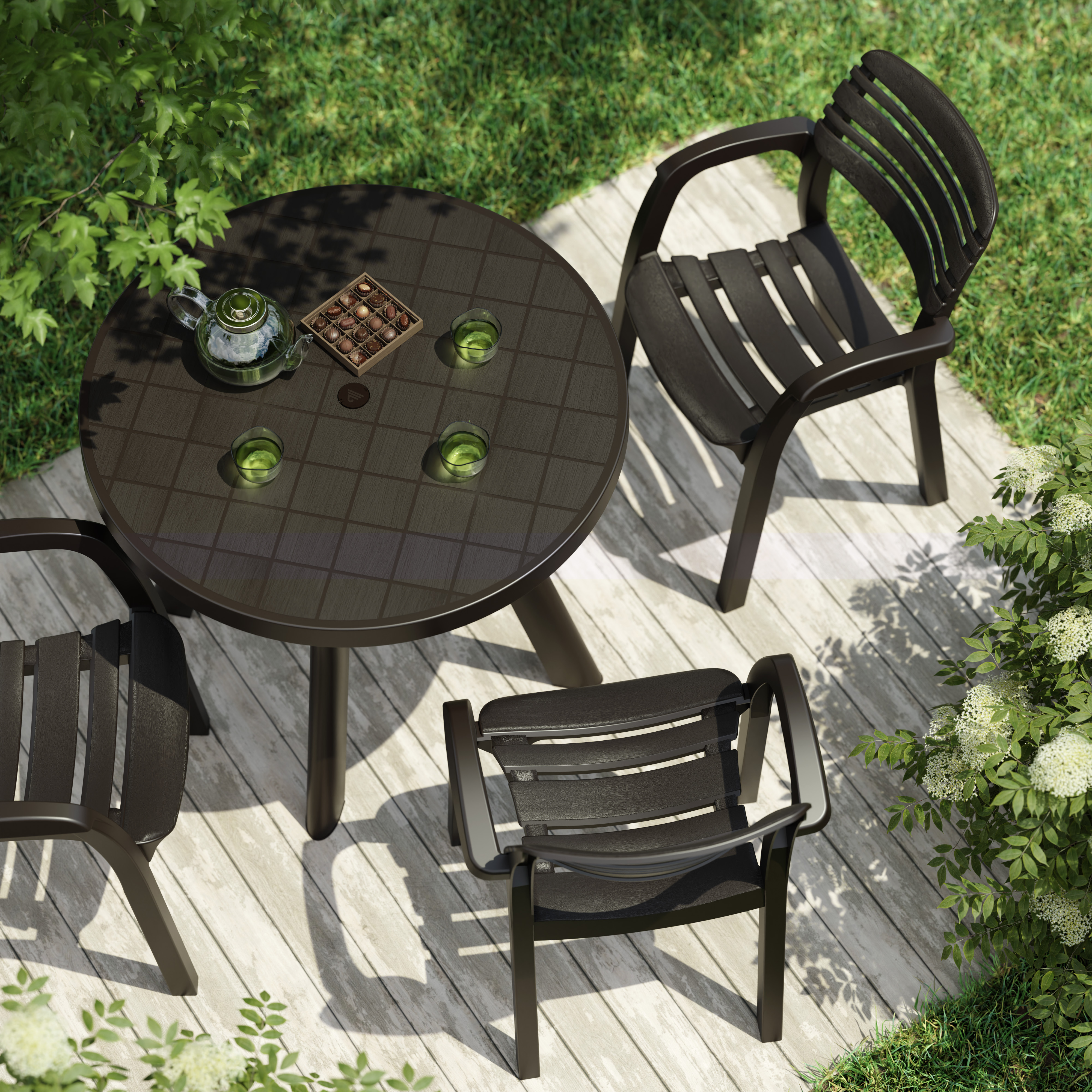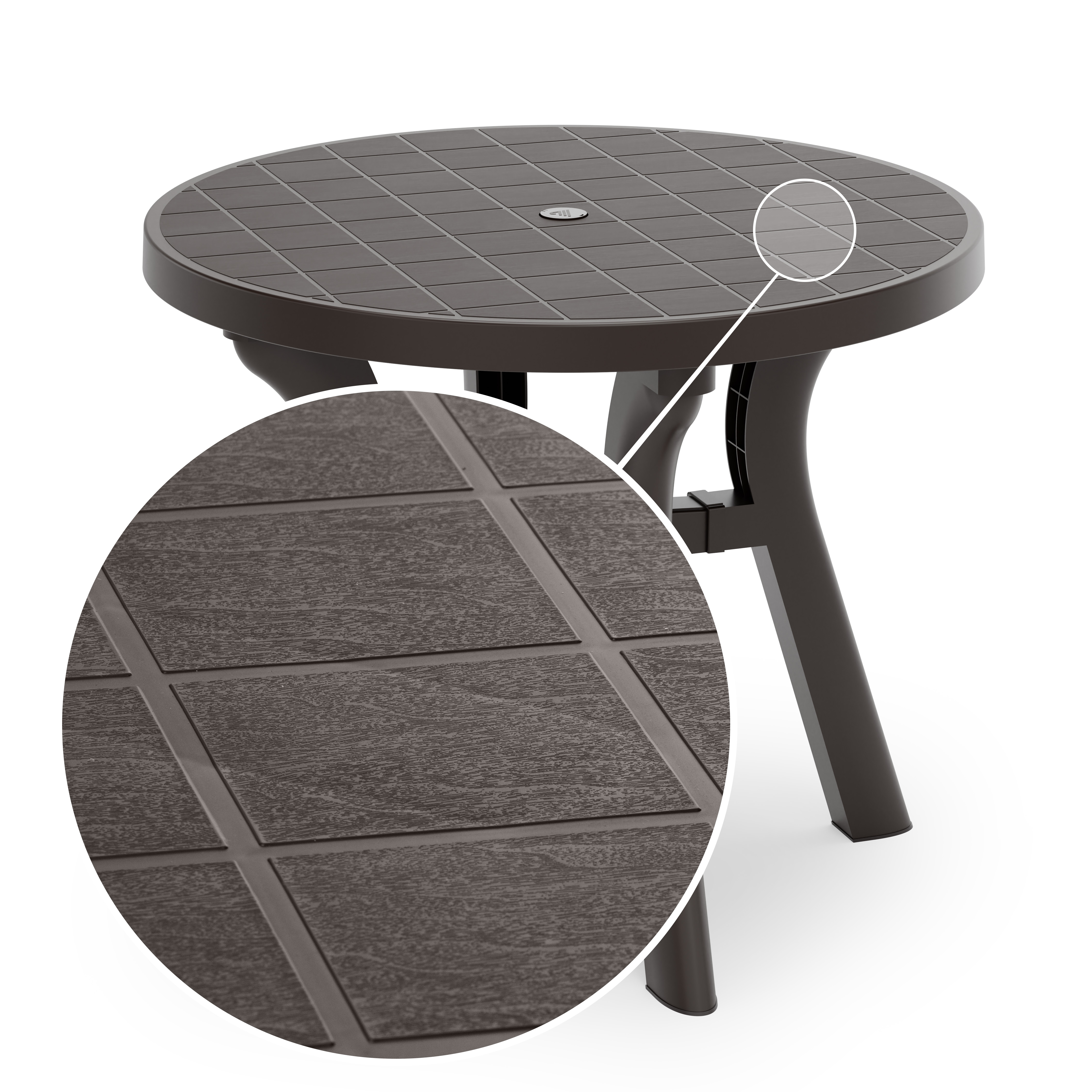 Стол "Атлант" с круглой столешницей имеет прочную конструкцию и устойчивый каркас, выдерживает воздействие внешних факторов, не теряя своего первоначального облика и качества. Изогнутые ножки соединены между собой крестовиной, что придает столу особую устойчивость. Ножки регулируются по высоте. Конструкция полностью разборная, что облегчает транспортировку и складирование. В центре столешницы имеется отверстие с заглушкой для установки зонта. Особенность данного стола в текстуре столешницы, которая эмитирует дерево.