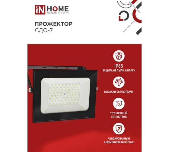 Линейка влагозащищенных светодиодных прожекторов СДО-7 ТМ IN HOME представлена в диапазоне мощностей от 20Вт до 100Вт. Благодаря высокому уровню герметичности (степень защиты IP65) прожектор может использоваться для экономичного наружного освещения памятников и инсталляций, рекламных объектов, фасадов зданий, детских/спортивных площадок, промышленных и складских помещений, внутренних дворов, придомовых территорий и др.Оборудован поворотным кронштейном, позволяющим легко регулировать угол освещения.Прочный корпус не подвержен деформации и устойчив к механическим повреждениям. Выполнен из металлического сплава, обеспечивающего высокое качество теплоотвода и защиту от коррозии.
