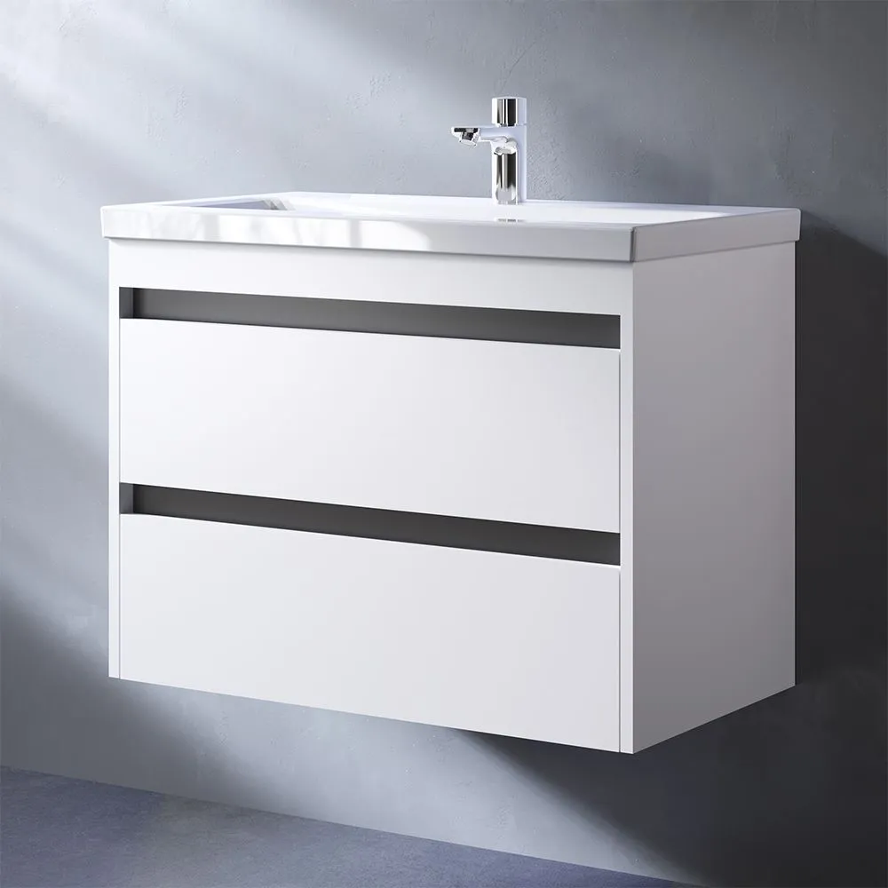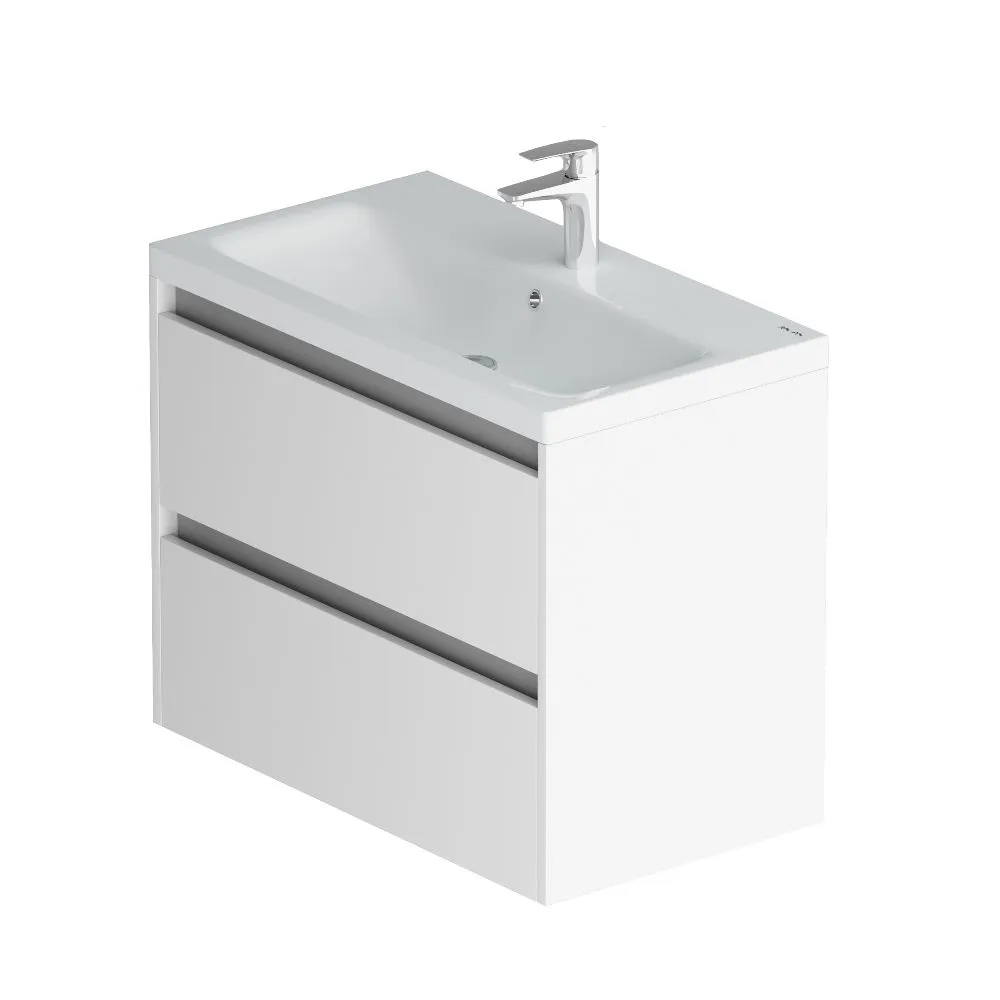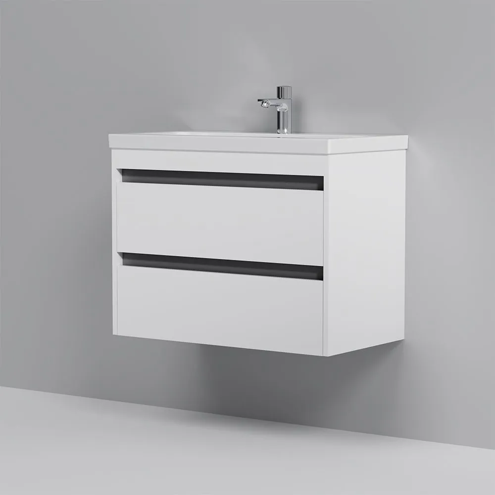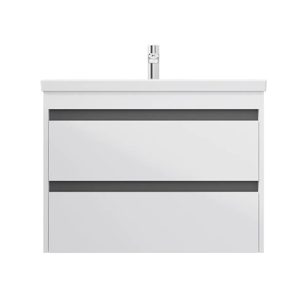 Мебель для ванной Pulse в стиле минимализм. Белые глянцевые фасады дополнены вставкой в цвете графит. Внутреннее покрытие каждого ящика выполнено в современном цвете Anthracite и имеет противоскользящее покрытие. Мягкое открытие и закрытие ящиков обеспечивают направляющие скрытого монтажа с системой мягкого закрывания soft close. Фасад и корпус тумбы покрыты экологически чистыми и долговечными полиакриловыми эмалями, которые наносятся по специальной технологии покраски в 7 слоев. Это обеспечивает насыщенный цвет в течение всего срока службы (от 10 лет). Тумба комплектуется раковиной Gem. Это самая компактная и функциональная раковина на рынке: проекция всего 42 см при максимальной глубине чаши! Раковина изготовлена из стекловидного фарфора, самого гигиеничного и влагостойкого материала.Характеристики: