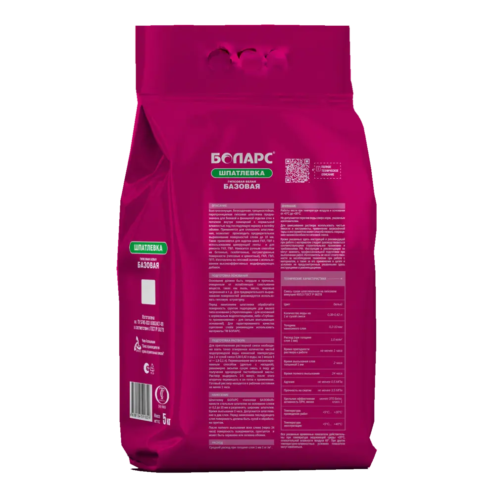 Универсальная шпатлевка Боларс Базовая - это сухая строительная смесь на основе белого природного гипса с добавлением высокоэффективных полимерных модификаторов. Материал предназначен для выравнивания и финишной отделки внутренних поверхностей: стен и потолков в жилых и общественных помещениях с нормальной влажностью. С ее помощью устраняют мелкие дефекты, неровности и шероховатости, создают гладкую, однородную подложку. Продукт подходит для сплошного шпатлевания слоем до 5 мм (допускается нанесение в несколько слоев), заделки швов гипсокартонных и гипсоволокнистых листов (с применением армирующей ленты), а также для локального ремонта поверхностей. Шпатлевка совместима с бетонными, газобетонными, оштукатуренными основаниями, гипсокартоном (ГКЛ), гипсоволокном (ГВЛ) и пазогребневыми плитами (ПГП).