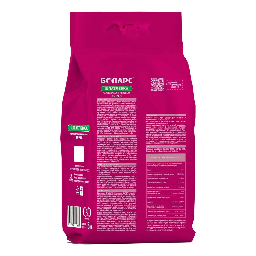 Суперфинишная шпатлевка Боларс Финишная Super - это высококачественный отделочный материал на полимерной основе, предназначенный для завершающего этапа выравнивания поверхностей перед декоративной отделкой. Продукт позволяет добиться идеально гладкой, белоснежной основы под покраску, оклейку обоями или нанесение тонких декоративных покрытий. Она эффективно скрывает мелкие дефекты, микротрещины и неровности, создавая безупречную поверхность без меления и шероховатостей. Материал подходит для подготовки оснований под самые требовательные финишные покрытия, где критичны гладкость и однородность подложки. Шпатлевка применяется в жилых и общественных интерьерах: в гостиных, спальнях, офисах, магазинах и других помещениях с нормальной влажностью.