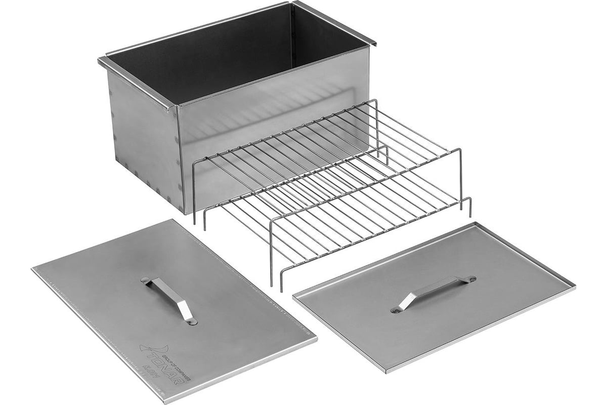 Двухъярусная коптильня с поддоном для сбора жира Тонар 450x280x240 мм, сталь 1.5 мм К-001 используется для горячего копчения сала, мяса, рыбы и дичи на открытом воздухе.