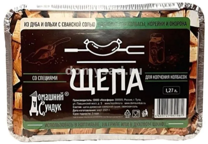 Щепа для копчения колбасок. Щепа со специями из дуба и ольхи с сванской солью подходит для колбасы, корейки и окорока. Щепа фасована в алюминиевые лотки объемом 1,27л. В каждом лотке вы найдете все необходимые специи, которые помогут приготовить мясо, птицу или рыбу. Щепа изготавливается из первосортного природного сырья. В ней нет химических примесей, она не содержит кору и древесную пыль. Благодаря сохранению сухости, срок годности щепы очень продолжительный. Щепу в алюминиевом лотке удобно использовать для копчения где угодно – дома и на природе. В силу высокого качества щепы все приготовленные на ней блюда аппетитны на вкус и необычайно ароматно пахнут.